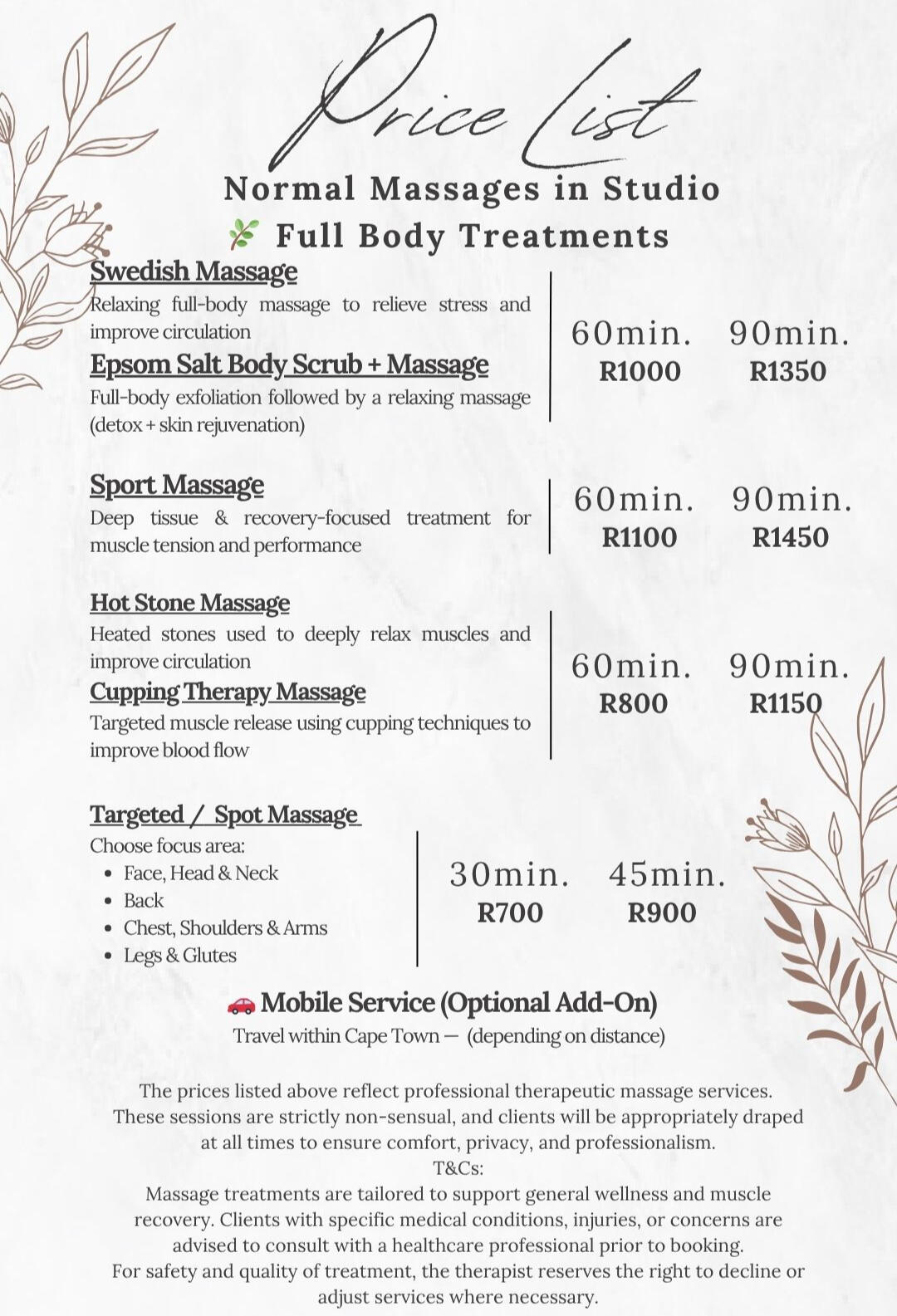 Price list for Normal massages