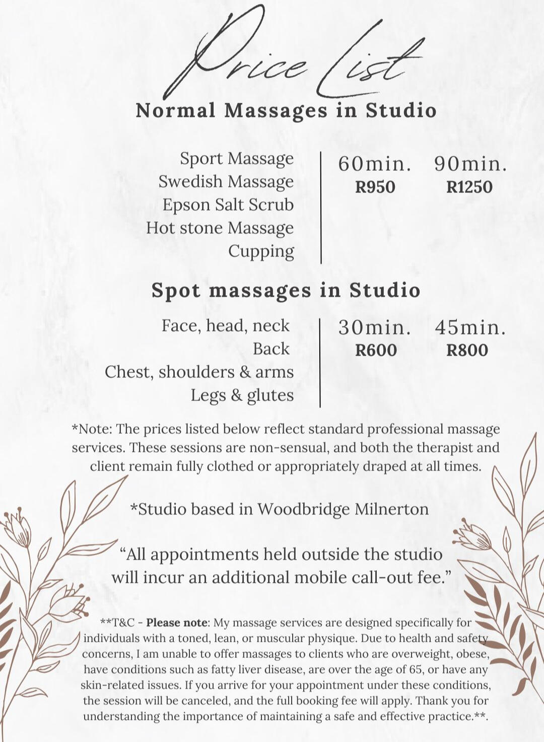 Sensual Nuru ExperienceImmerse yourself in a deeply relaxing, full-body experience designed to awaken the senses and melt away tension. Warm oils, slow movements, and a calming atmosphere combine to create a feeling of deep connection, comfort, and tranquility.Choose between two exclusive options:Light Classic Session (R3600)A deeply personalized relaxation experience designed to calm the mind and awaken the senses. This indulgent session focuses on full-body rejuvenation through rhythmic touch, warm oils, and an atmosphere of quiet connection — leaving you fully restored and balanced.VIP Experience (R7000)A private, luxurious escape created for total sensory immersion. Soft lighting, candles, flowers, and fine details set the tone for a deeply nurturing experience. This signature session blends mindful touch and flowing movement to promote complete relaxation, renewal, and a heightened sense of wellbeing.Consultation Requirement