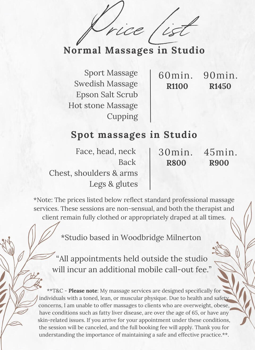 As a skilled practitioner in the field of massage therapy, I am pleased to offer a range of specialized services designed to promote optimal physical health and wellness. My expertise includes a comprehensive array of sports massages that cater to individuals seeking to enhance their performance and overall well-being.Through my meticulous application of advanced techniques, I am able to deliver a highly personalized and deeply therapeutic massage experience that addresses the unique needs of each individual. In addition to offering services at my studio, I am also available to travel to clients' locations to provide a seamless and convenient service.My massage treatments are rooted in a deep understanding of the human anatomy and physiology, and are designed to facilitate the optimal functioning of the lymphatic system, promote blood flow to muscle tissue and organs, and accelerate the recovery and healing of tissue. The modalities I specialize in include deep tissue, Swedish, full body, hot stone, and cupping massages, all of which contribute to the ultimate relaxation and rejuvenation of the mind, body, and spirit.